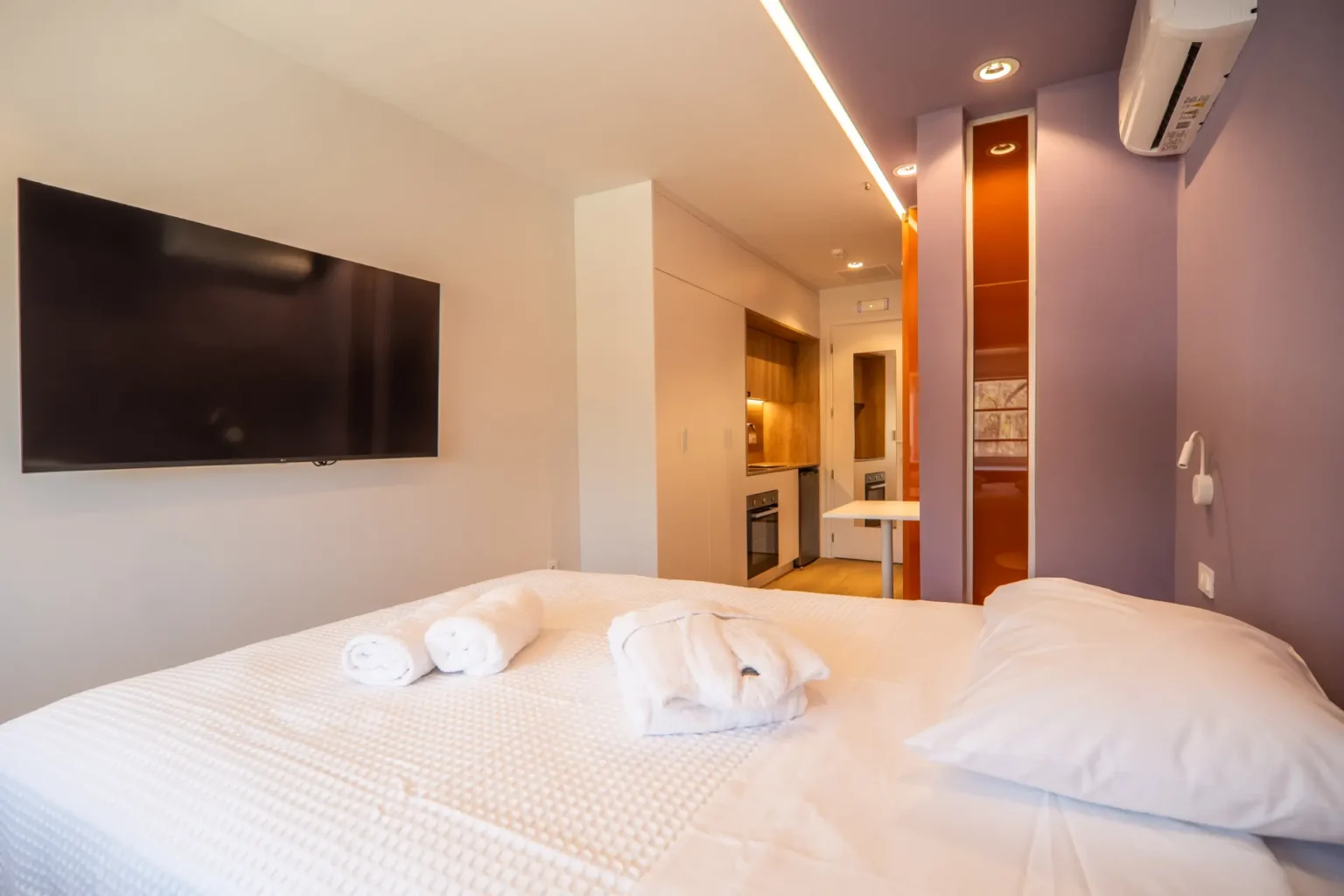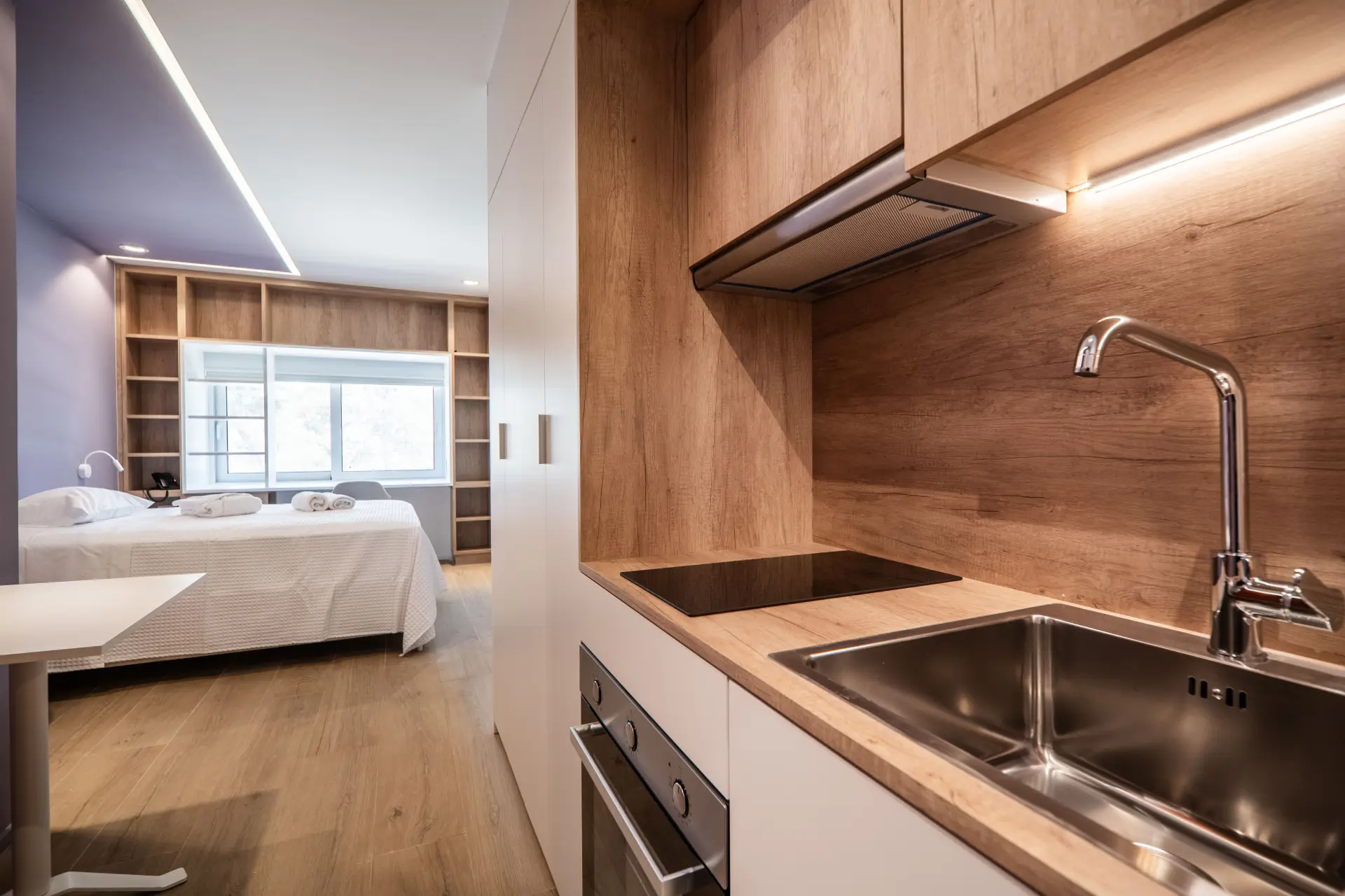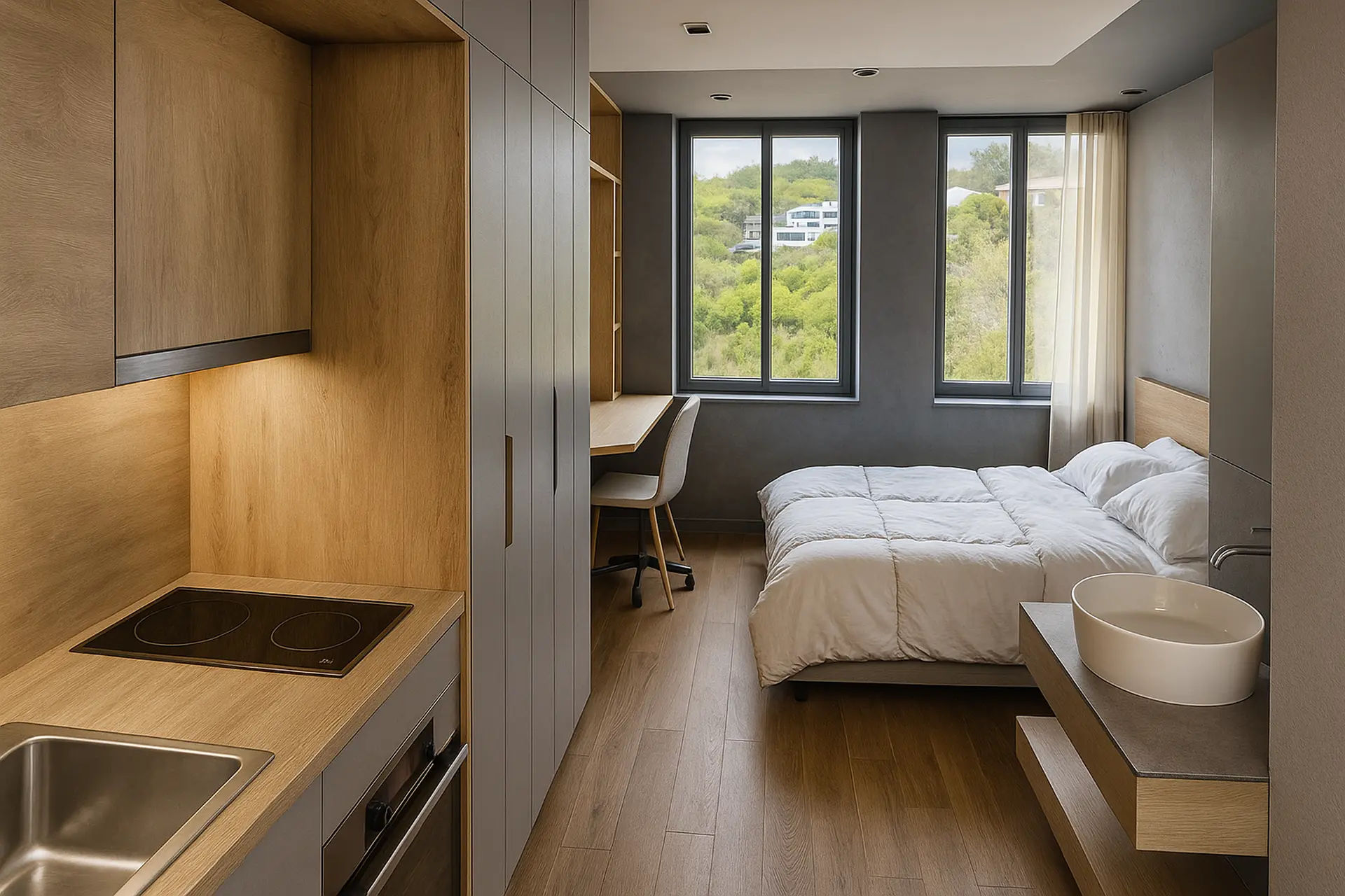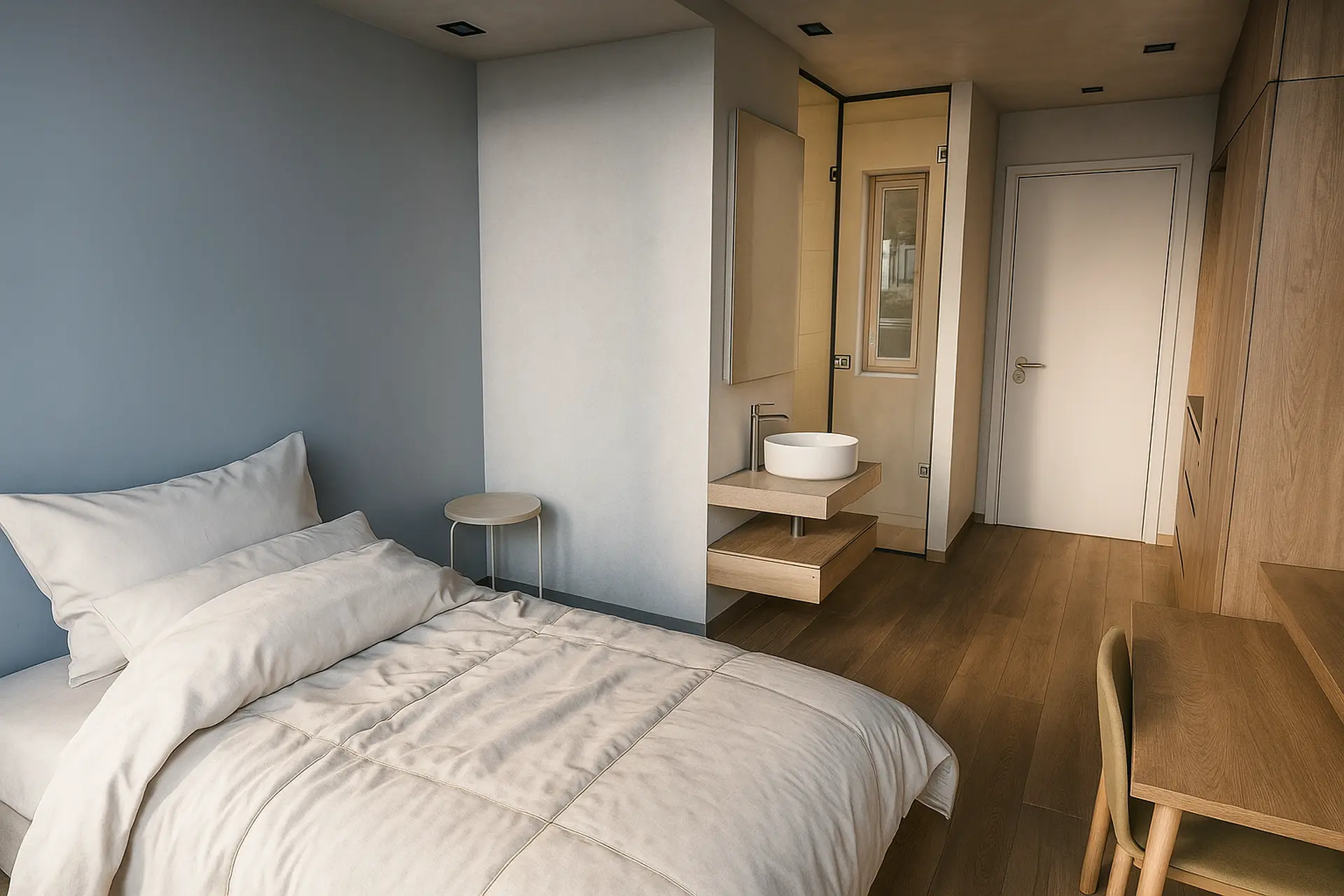 The Classic Studios are the smallest rooms at Campus Living, with surfaces of 21 m². They consist of a single open-plan modern space with a bathroom, featuring one bed and a fully equipped kitchen. The kitchen includes an oven, stovetops, refrigerator, and all essential utensils. For study or work, there is a desk, office chair, and storage space. The bathroom features a spacious shower and sink. Each room also includes a smart TV, wardrobe, air conditioning, and soundproofing.