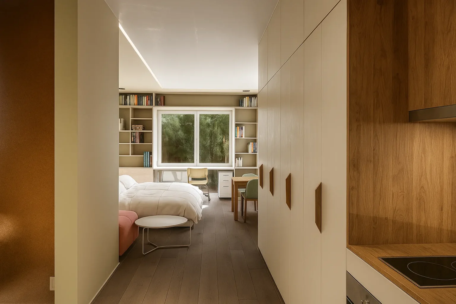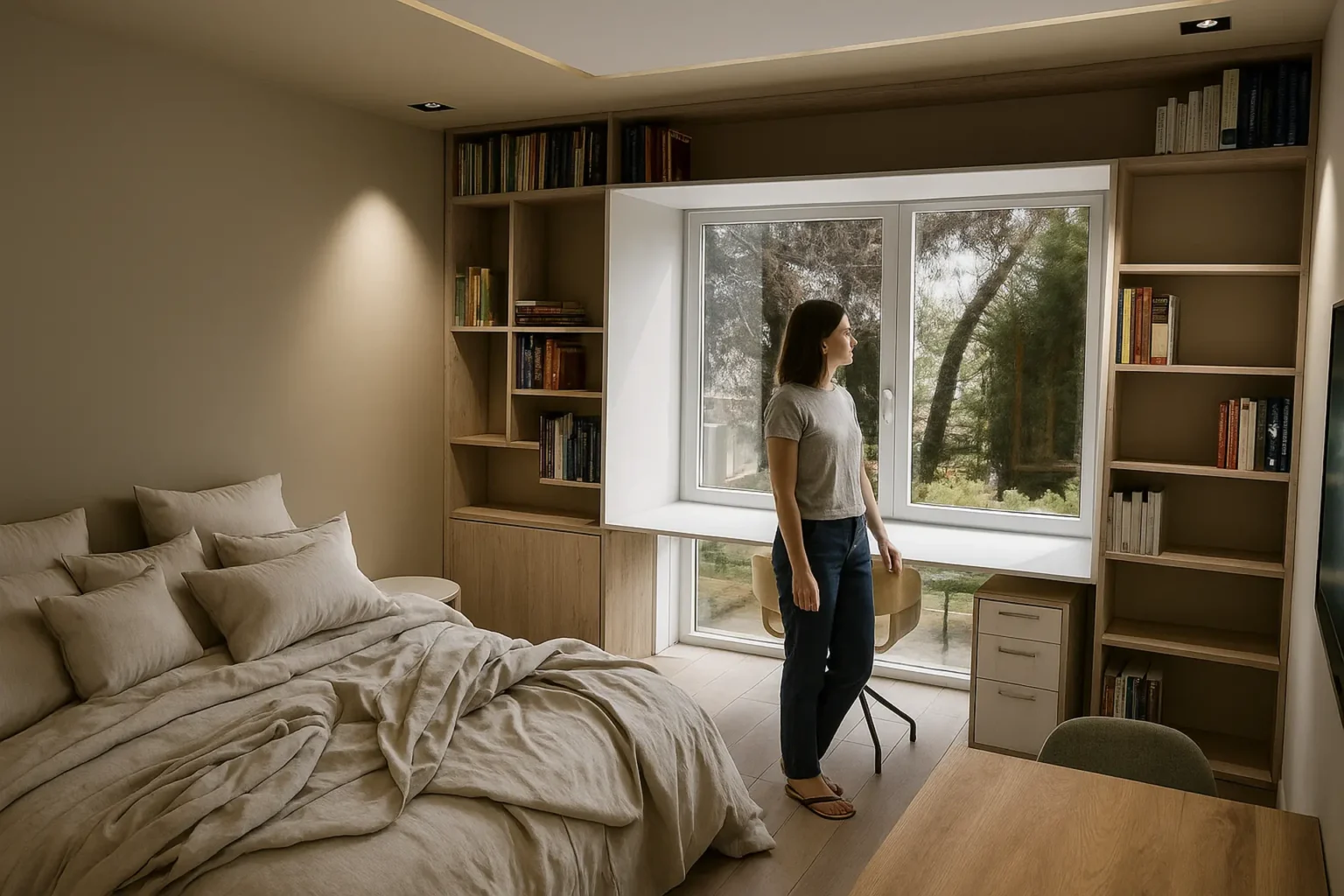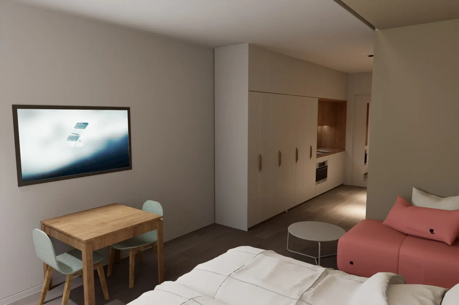 The Deluxe Studios are larger rooms of 30 m², with increased comfort. They consist of a single open-plan modern space with a bathroom, featuring one bed and a fully equipped kitchen. The kitchen includes an oven, stovetops, refrigerator, and all essential utensils. For study or work, there is a desk, office chair, and storage space. The bathroom features a spacious shower and sink. Each room also includes a smart TV, wardrobe, air conditioning, and soundproofing.