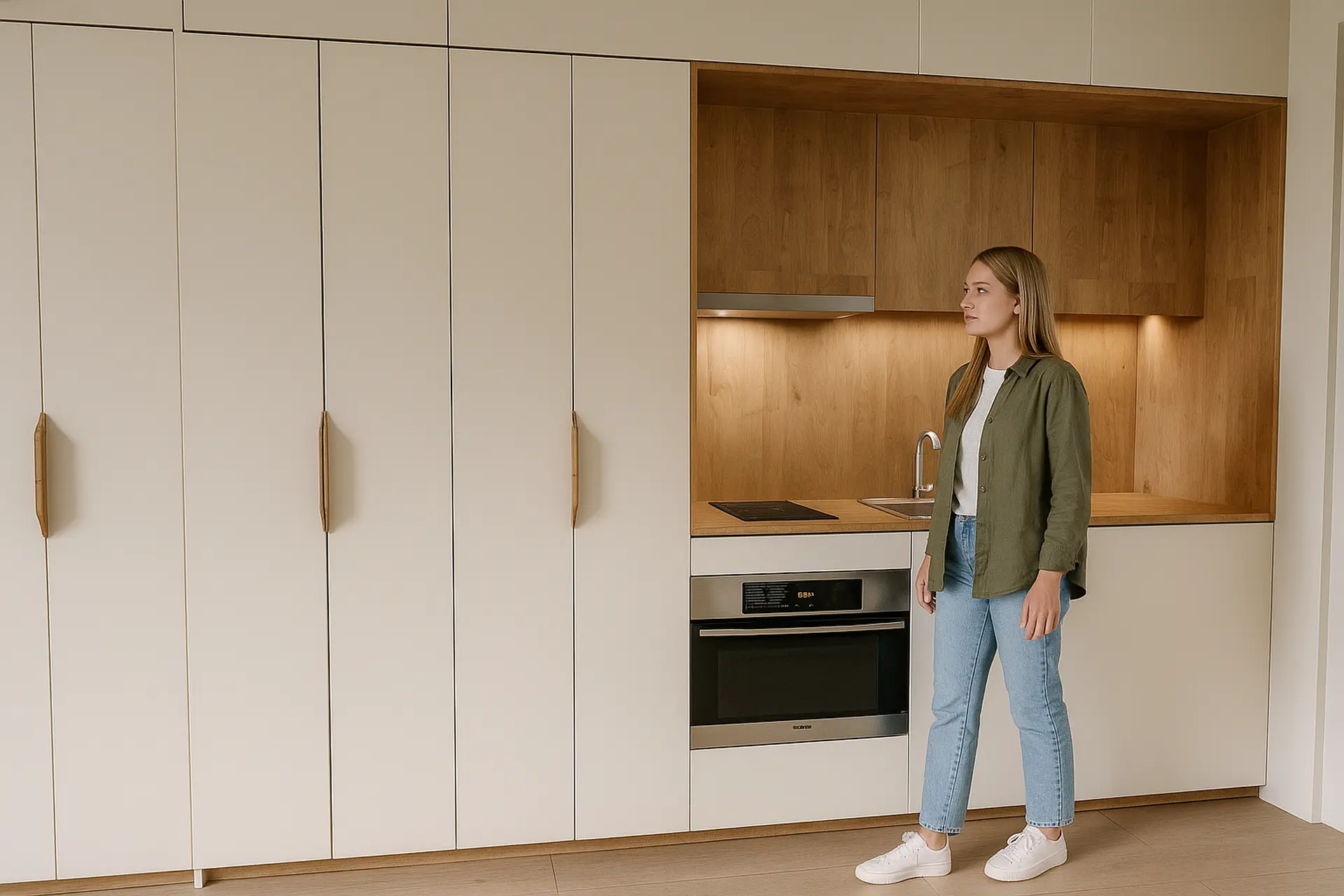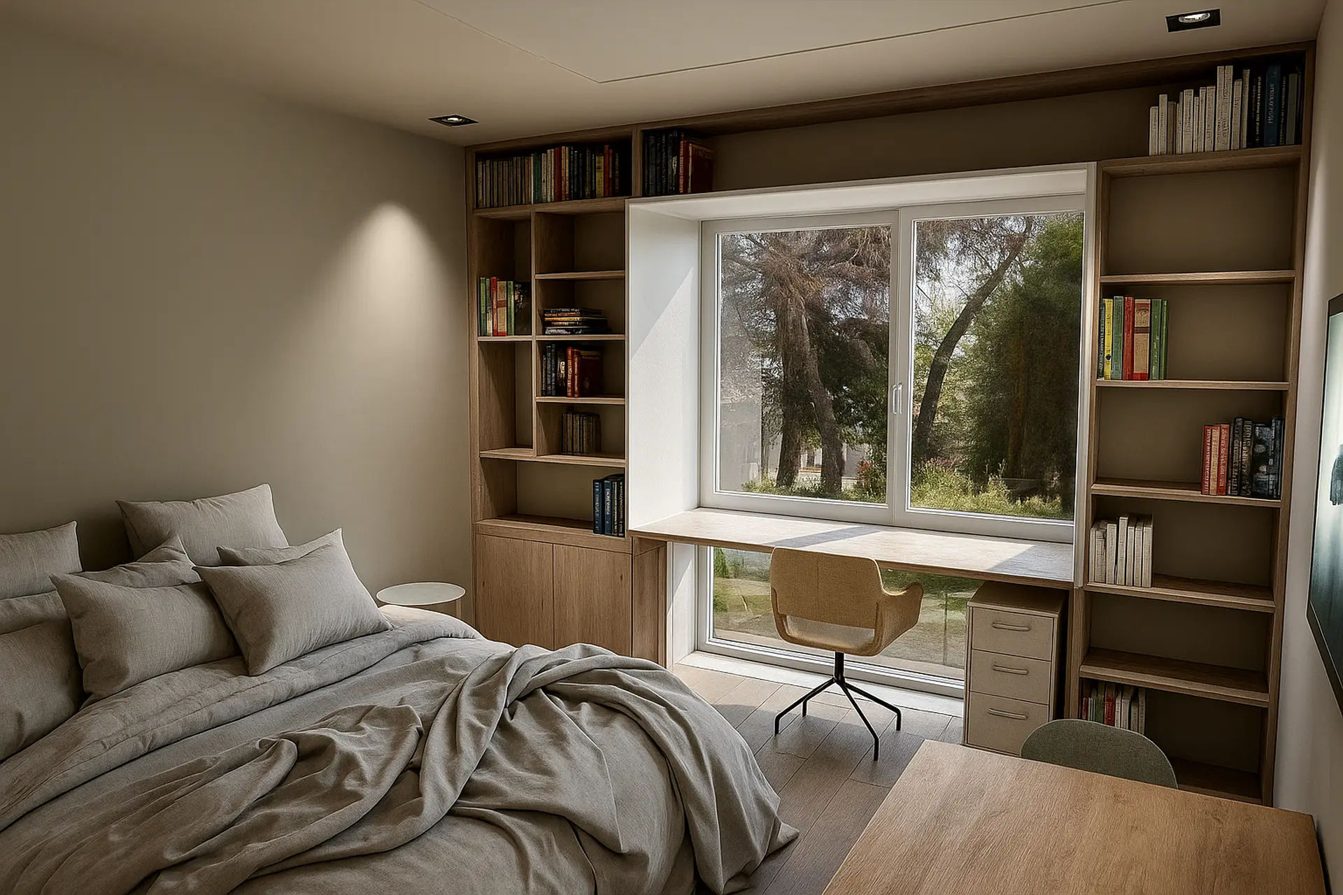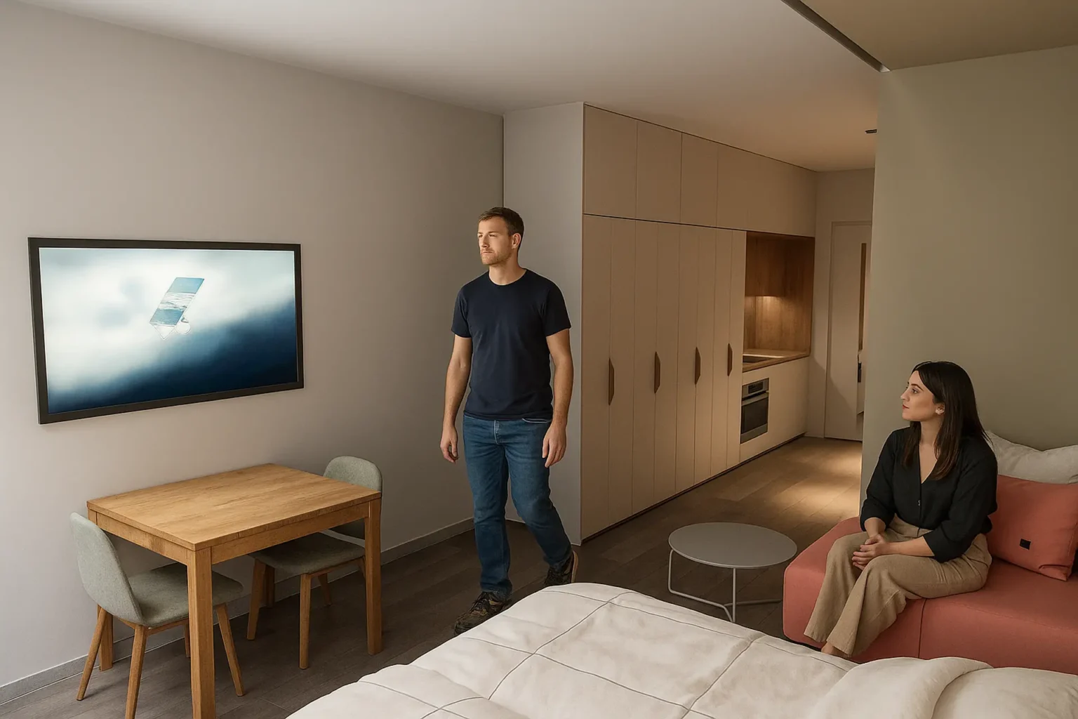 The Deluxe Studios are larger rooms of 30 m², with increased comfort. They consist of a single open-plan modern space with a bathroom, featuring one bed and a fully equipped kitchen. The kitchen includes an oven, stovetops, refrigerator, and all essential utensils. For study or work, there is a desk, office chair, and storage space. The bathroom features a spacious shower and sink. Each room also includes a smart TV, wardrobe, air conditioning, and soundproofing.